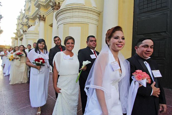 Con su atuendo de novia acampanado, Pilín abrazó a su esposo Alfredo Castillo, de 39 años; sujetó su ramo de flores y recibió emocionada el sacramento del matrimonio en la Basílica. Ellos formaron parte del grupo de 22 parejas que santificaron su hogar.