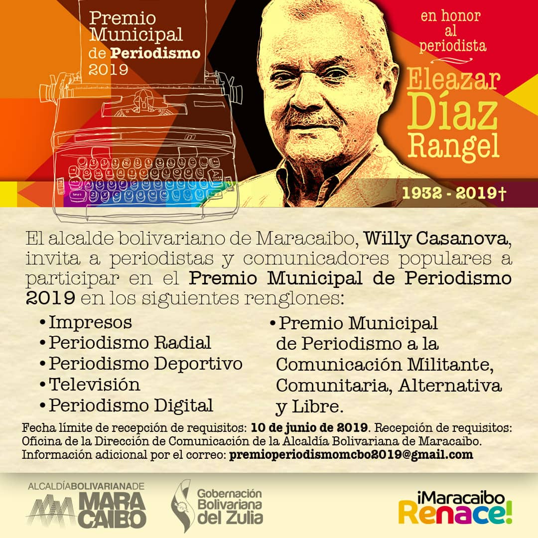 Para reconocer y premiar la labor informativa desarrollada por los periodistas en el municipio, la Alcaldía Bolivariana de Maracaibo entregará el Premio Municipal de Periodismo 2019, en honor al periodista venezolano Eleazar Díaz Rangel, fallecido el 24 de abril de este año.