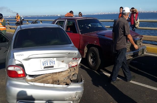 La mañana de este martes un choque entre dos vehículos modelos Accent y Conquistador paralizó el transito en el Puente General Rafael Urdaneta de Maracaibo sentido hacia la Costa Oriental del Lago.