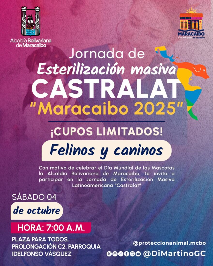A propósito de celebrarse el próximo 04 de octubre el “Día Mundial de las Mascotas, la Alcaldía Bolivariana de Maracaibo, a través del Instituto Municipal de Protección Animal (IMPA), anunció su participación en la jornada masiva de castración latinoamericana “Castralat 2025”, la cual se llevará a cabo en las instalaciones de la Plaza Para Todos, una iniciativa que busca combatir el abandono, maltrato animal y la sobrepoblación de perros y gatos.