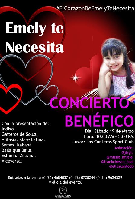 Familiares, amigos, artistas, cantantes y locutores se unen en función de poder adquirir los recursos económicos para lograr un corazón para Emely. Con la presentación de: Indigo, Gaiteros de Soluz, Alitasía, Klase Latina, Somos, Kabana, Baila que Baila, Estampa Zuliana, Viceversa y muchos talentos que se siguen sumando, presentados por los locutores Zulianos José Luis Gil, Lisseth Gutierrez, Frankchesco Drubio y las chicas del programa radial Ellas con Todo transmitido por la Súper 93 FM.