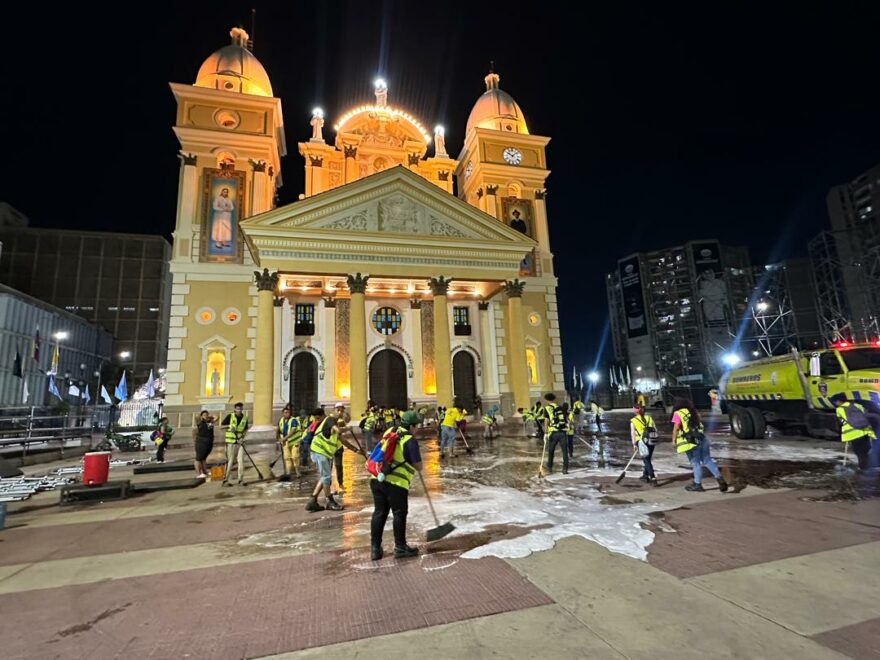 Más de 60 trabajadores de barrido manual, hombres y mujeres, se desplegaron la noche del miércoles 22 de octubre para limpiar a fondo la plazoleta y las áreas adyacentes al templo. La jornada contó con el apoyo logístico de un camión cisterna del Cuerpo de Bomberos de Maracaibo, el cual utilizó más de 8 mil litros de agua para el lavado, enjabonado y barrido de todo el perímetro de la plaza.