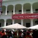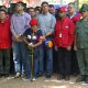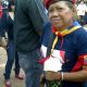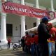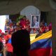 La mayoría de los asistentes están vestidos de rojo y cargan en sus manos un objeto alusivo a la imagen del comandante.