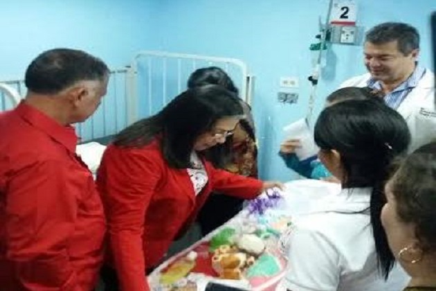 El Gobernador del estado Zulia Francisco Arias Cárdenas junto a la Primera Combatiente Margarita Padron de Arias entregaron, este domingo de Navidad canastilla al primer niño zuliano nacido en Nochebuena y juguetes en diversos centros hospitalarios de la región.