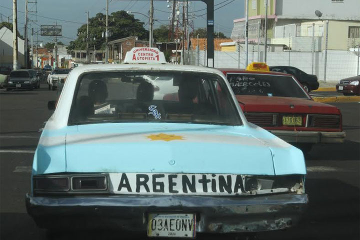 La emoción por el mundial se expresa de cualquier forma. Con su estilo particular, los marabinos han decidido apoyar a sus selecciones favoritas y este chofer de carrito por puesto lo demuestra. El zuliano decidió pintar su vehículo con la bandera de Argentina en apoyo a su equipo que juega este miércoles contra Nigeria.