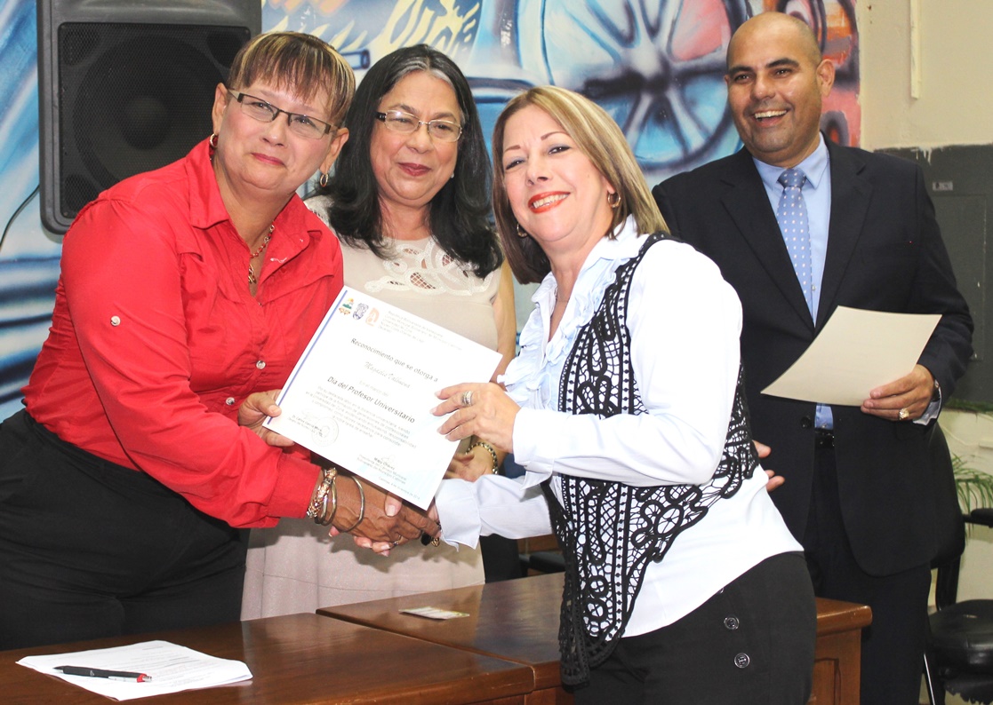 Con motivo de ser partícipe de la generaciones de profesionales por 28 años del núcleo LUZ-COL, en cálculo 1 y álgebra lineal, ejerciendo la docencia universitaria, con entusiasmo responsabilidad y compromiso, la Profesora, Margarita Padrón de Arias, recibió una placa como reconocimiento a su distinguida labor en la casa de estudios, LUZ de Cabimas.