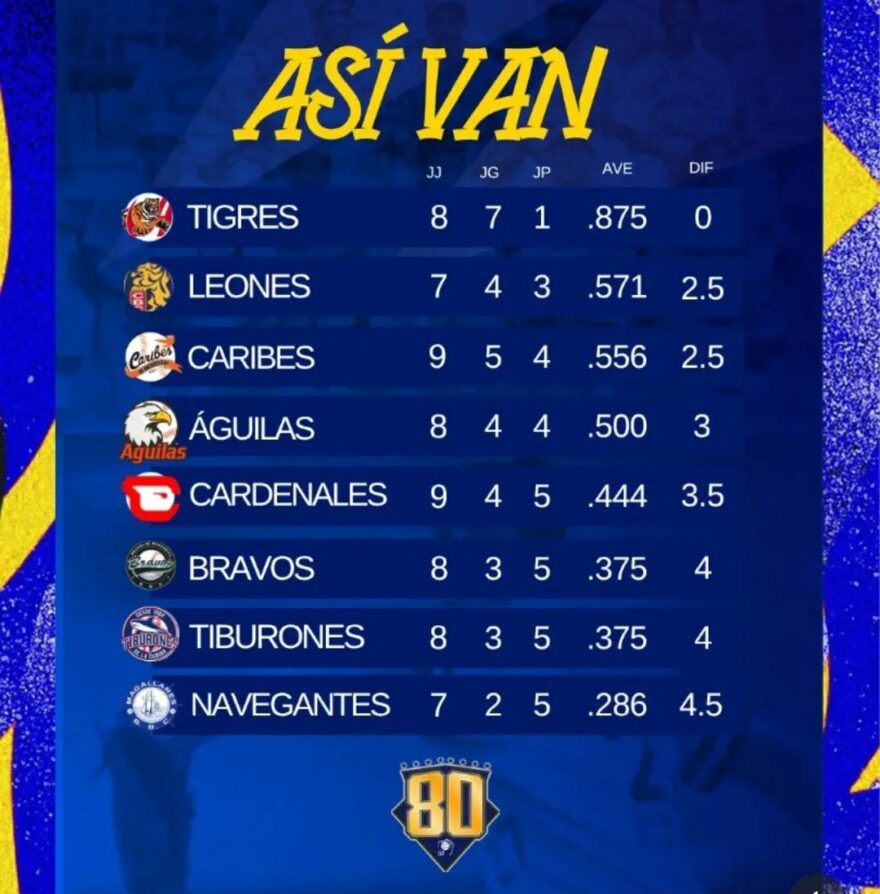 La tabla de posiciones del béisbol venezolano se mantiene sin cambios tras la jornada de hoy. Los Tigres de Aragua aseguraron su liderato al vencer 5-4 a los Cardenales de Lara. Magallanes venció 5-4 a los Bravos de Margarita, Caribes venció ampliamente a Leones del Caracas 7-4. Por su parte, las Águilas del Zulia también lograron una victoria apretada, superando 4-3 a Los Tiburones de La Guaira.