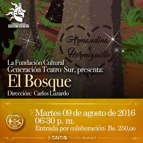 El escenario del Teatro Baralt recibe a la Fundación Cultural Generación Teatro Sur y su obra El Bosque, una tragicomedia basada en entretejidas situaciones, dirigida por Carlos Luzardo, con breves fragmentos de textos de Shakespeare, Calderón de la Barca y Fernando Rojas. La cita es este martes 9 de agosto, a las 6:30 p.m.