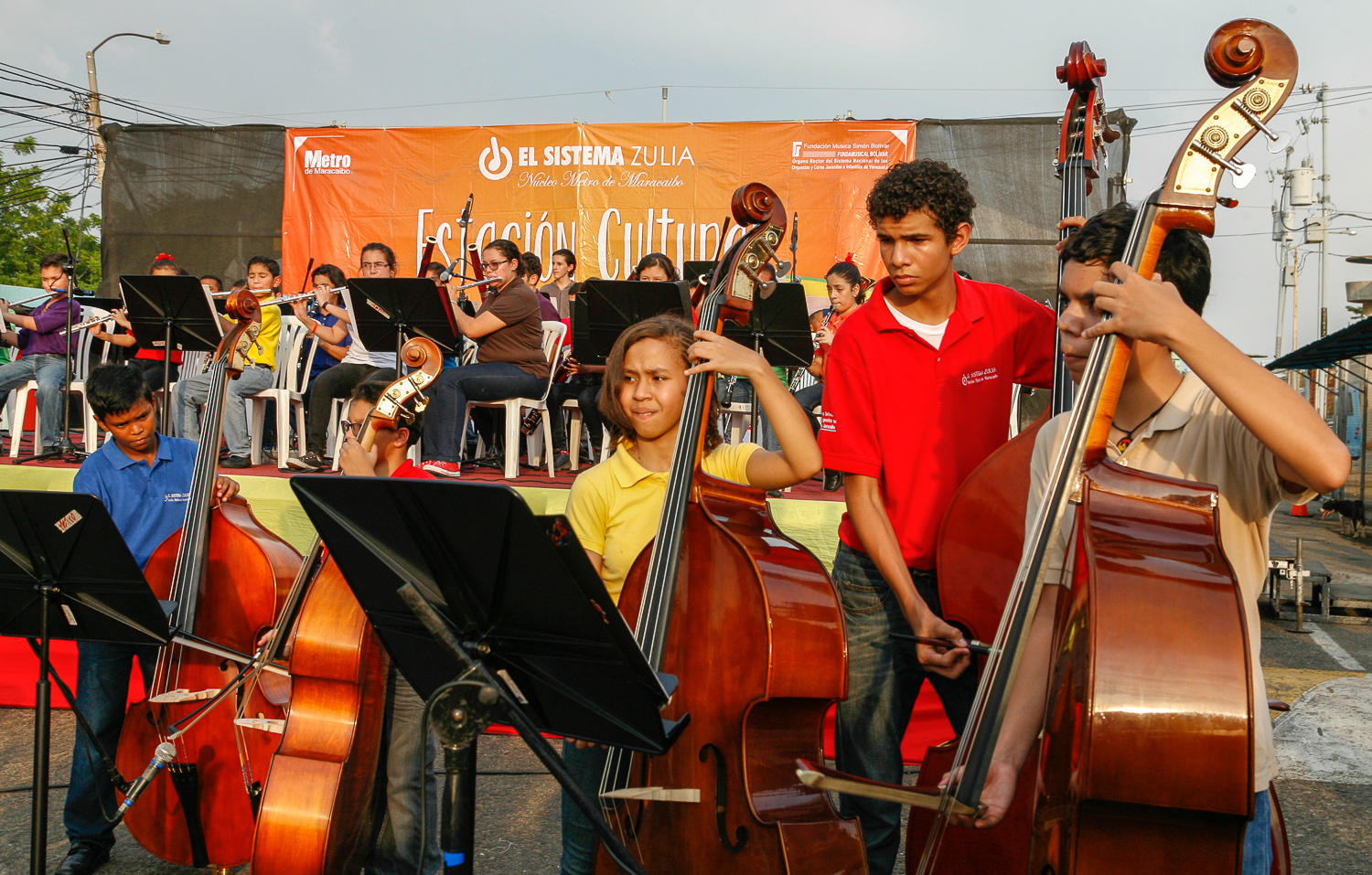 El protagonismo de los pequeños integrantes del Núcleo Orquestal y Coral del Metro de Maracaibo, perteneciente al Sistema Nacional de Orquestas Juveniles e Infantiles del maestro José Antonio Abreu, brilló en la tarima dispuesta en el barrio San Pedro de la parroquia Manuel Dagnino, donde la empresa de transporte masivo realizó este regalo musical para toda la comunidad marabina.