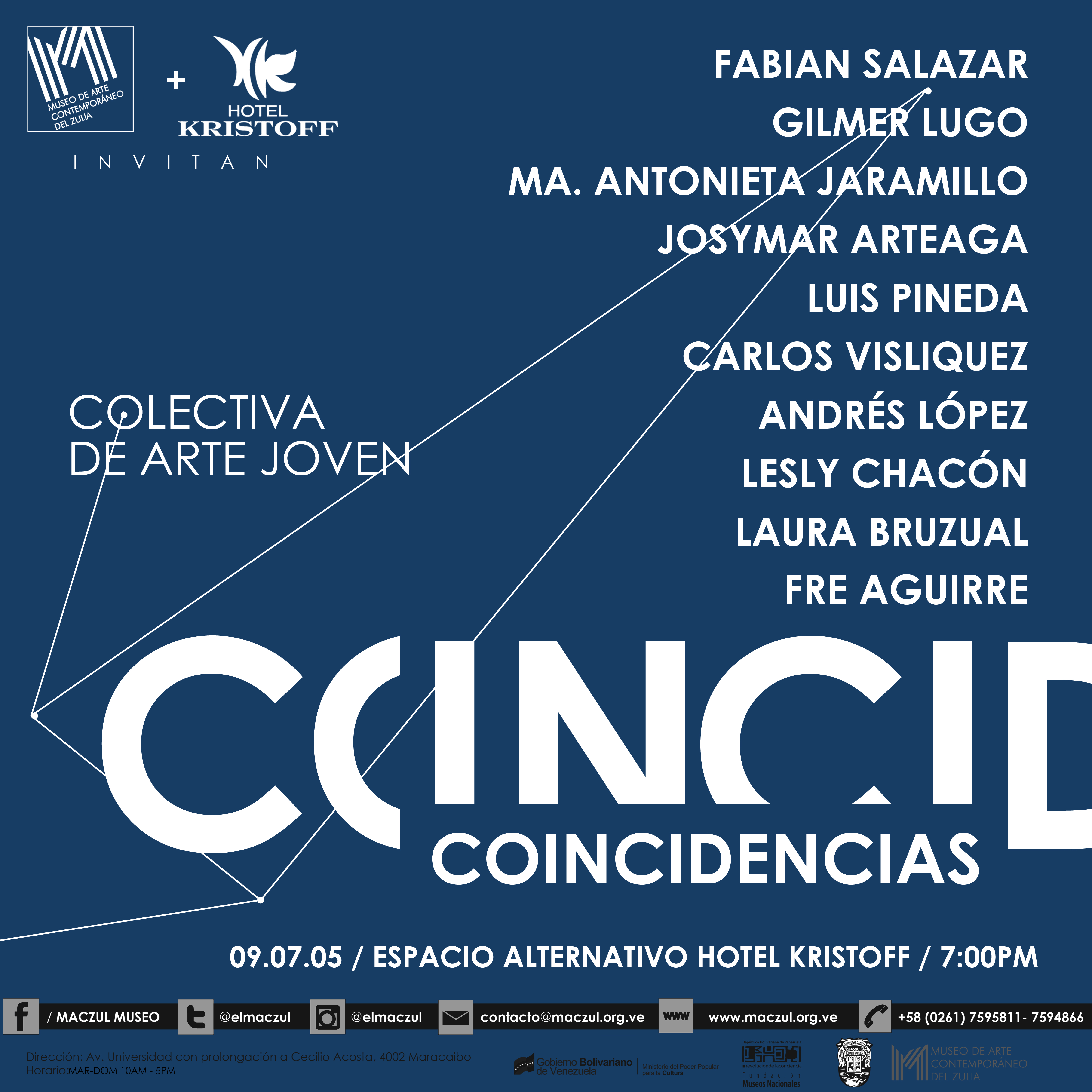 En una búsqueda de constantes respuestas a las permanentes preguntas sobre ¿Qué es el arte? y ¿Cuáles son sus límites?, propone esta muestra conceptualizada que lleva el nombre COINCIDENCIAS, que se trata de un Programa de Exposiciones Itinerantes que desarrolla el Museo de Arte Contemporáneo del Zulia (Maczul) y que en esta ocasión se dará en el Espacio Alternativo del Hotel Kristoff.