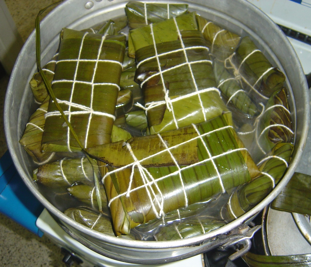 13. Por último, colocar las hallacas en un recipiente grande. Cubrirlas con agua y poner unas hojas de plátano encima para mantenerlas sumergidas. Tapar y cocinar durante una hora. Sacar con la espumadera y dejarlas escurrir sobre una superficie plana pero inclinada hasta que se enfríen.