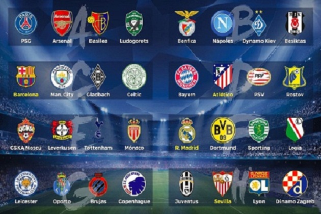 Además Benfica, Nápoles, Dinamo Kiev y Besiktas competirán en el B; CSKA Moscú, Bayer Leverkusen, Tottenham y Mónaco en el E; Leicester, Oporto, Brujas y Copenhague en el G y París SG, Arsenal, Basilea y Ludogorets en el A.