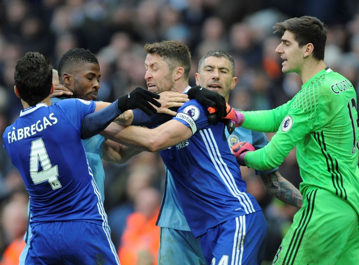 El partido terminó entre empujones y con las expulsiones del «Kun» Agüero y Fernandinho en los descuentos. El argentino recibió la tarjeta roja por una plancha sobre David Luiz, y el brasileño por empujar a Cesc Fábregas en el cuello en medio de la refriega provocada por esa falta.