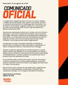 A través de un comunicado oficial, el equipo emplumado informó a su fanaticada, patrocinadores y la prensa que estos cambios buscan «garantizar un futuro competitivo dentro y fuera del terreno de juego». Con esta movida, el equipo del Zulia se enfoca en afinar todos los detalles para la campaña 2025-26.