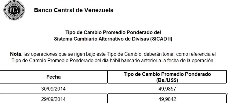El tipo de cambio promedio ponderado del Sistema Cambiario Alternativo de Divisas (Sicad 2) cerró el mes de septiembre y se ubicó este martes en 49,98 bolívares por dólar, informó el Banco Central de Venezuela (BCV) en su portal web.