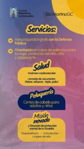 También habrá los servicios gratuitos de asesoría jurídica con la colaboración de la Defensoría Pública, peluquería para adultos y niños y niñas gracias al apoyo de la Misión Robert Serra, exámenes cardiovasculares, vacunación contra la fiebre amarilla, refuerzo, triple, polio, orientación en casos de violencia intrafamiliar, protección de niños, niñas y adolescentes, asi como violencia contra la mujer.