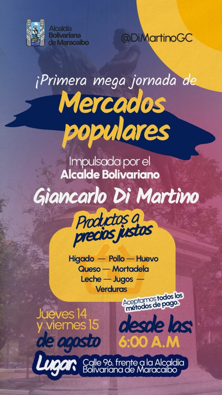 Como parte de las acciones de gobierno que viene impulsando el alcalde bolivariano de Maracaibo, Giancarlo Di Martino, se realizará durante los dias jueves 14 y viernes 15 de agosto, la primera jornada de mercados populares para beneficio de los marabinos.