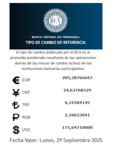 El Banco Central de Venezuela (BCV) informa al público en general, a las instituciones financieras y al sector productivo nacional la publicación del tipo de cambio de referencia que entrará en vigencia este lunes 29 de septiembre de 2025.