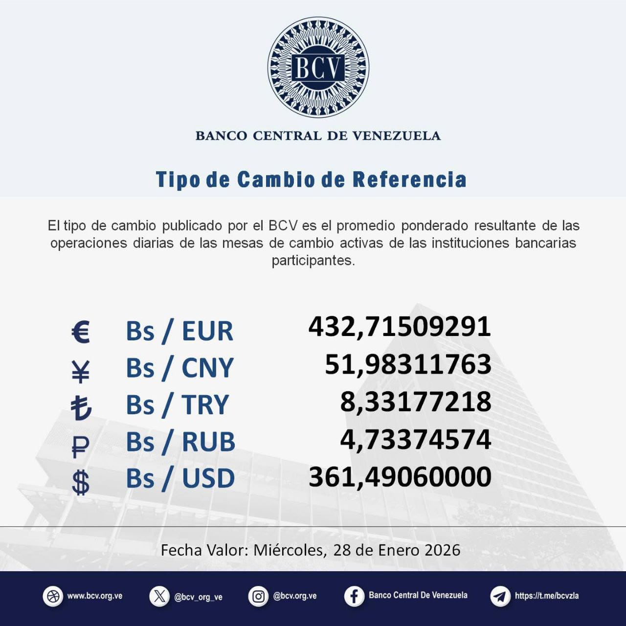 Esta tasa, que tendrá fecha valor para el miércoles 28 de enero de 2026, es el resultado del promedio ponderado de las operaciones diarias de las mesas de cambio activas de las instituciones bancarias participantes.