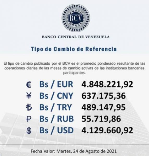 Por su parte, el Banco Central de Venezuela (BCV), reportó que la tasa de cambio oficial, correspondiente a este martes, aún por debajo del tipo de cambio paralelo, es de Bs. 4.129.660,92, un incremento de Bs. 6.196,6 con respecto al cierre del lunes reportado por el ente emisor.