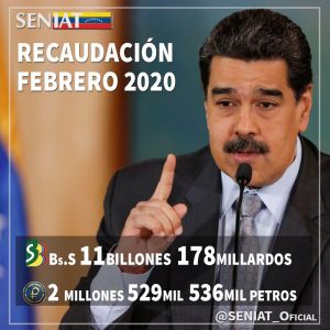 El Servicio Nacional Integrado de Administración Aduanera y Tributaria (SENIAT), recaudó solo en el mes de febrero un total de 11 billones 178 millardos 347 millones 585 mil 226 bolívares, equivalentes a 2 millones 529 mil 536 Petros, entre Impuesto Sobre la Renta (ISLR), Impuesto al Valor Agregado (IVA), Aduanas y Rentas Internas (que equivalen a derechos pendientes, multas, intereses, reintegros al Fisco, sucesiones y otros conceptos).
