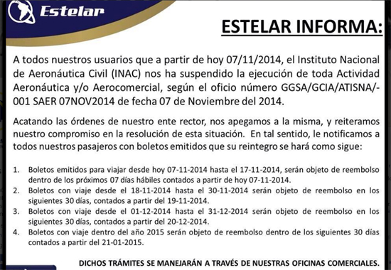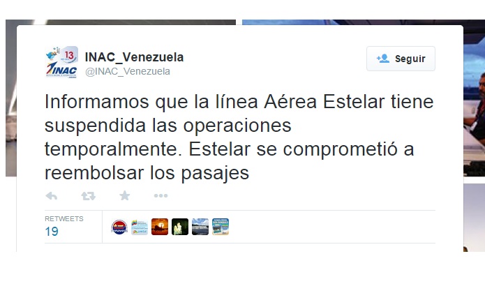 «Informamos que la línea Aérea Estelar tiene suspendida las operaciones temporalmente. Estelar se comprometió a reembolsar los pasajes», publicó en uno de sus mensajes el INAC.