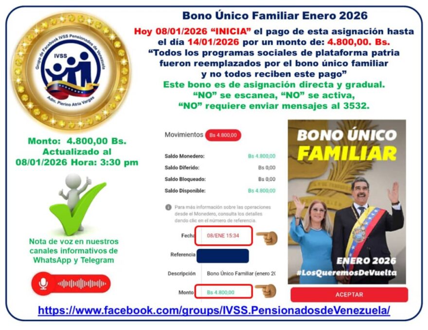 Este jueves 8 de enero, comenzó la distribución del bono único familiar mediante la plataforma patria. El monto asignado para este beneficio es de 4.800 bolívares, según informaron los canales oficiales de comunicación del sistema. Los beneficiarios están siendo informados de manera progresiva a través de una notificación directa en sus dispositivos móviles o al ingresar a la plataforma.