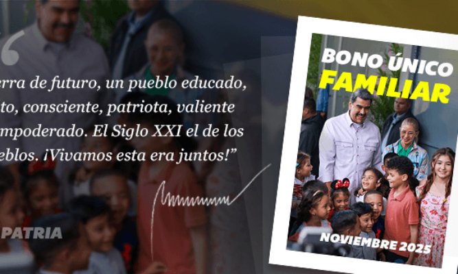 El Gobierno de Nicolás Maduro ha iniciado este lunes 3 de noviembre la entrega del Bono Único Familiar a través del Sistema Patria, un subsidio que agrupa los beneficios sociales principales como Hogares de la Patria, Parto Humanizado y otros programas.