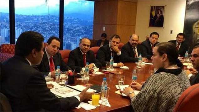 En compañía del jefe de Estado se encuentran la ministra de Comunicación y la Información, Delcy Rodríguez; Carlos Osorio, ministro del Despacho de la Presidencia y Seguimiento de la Gestión de Gobierno, y el vicepresidente para el Área Económica y Finanzas y ministro de Economía, Finanzas y Banca Pública, Rodolfo Marco Torres.