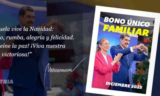 El gobierno de Nicolás Maduro anunció este martes 2 de diciembre el inicio de la entrega del Bono Único Familiar correspondiente al mes de diciembre, así como el desembolso del bono Cultores Populares, ambos gestionados a través del Sistema Patria.