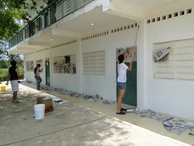 Entrando en detalles, en cuanto al trabajo físico, los muchachos se esmeraron en pintar tanto por dentro como por fuera la edificación donde se encuentran los 6 salones donde ven clases los niños de 1ro a 6to grado de educación básica, así como los baños y la entrada al colegio. Fue impresionante verlos tan entusiasmados. Tanto así que un grupo de “remeros” decidió trabajar todo el día de descanso previo a la finalización del Campamento, hasta las 8 de la noche, sólo para terminar de pintar los baños (trabajo que no estaba dentro de los planes iniciales establecidos), y aun así seguían alegres y enérgicos cantando y disfrutando entre ellos, toda vez que veían e imaginaban con alegría que los niños en Septiembre recibirían un nuevo colegio cuando regresasen a clases. Igualmente, se restauró el cartel que está afuera del colegio donde se encontraba (y ahora otra vez) el nombre y la insignia de la institución.