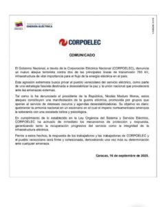 “En cumplimiento de lo establecido en la Ley Orgánica del Sistema y Servicio Eléctrico, Corpoelec ha activado de inmediato los mecanismos de protección y respuesta, garantizando tanto la recuperación progresiva del servicio como la integridad de la infraestructura eléctrica”, se lee en la misiva, A continuación comunicado íntegro:
