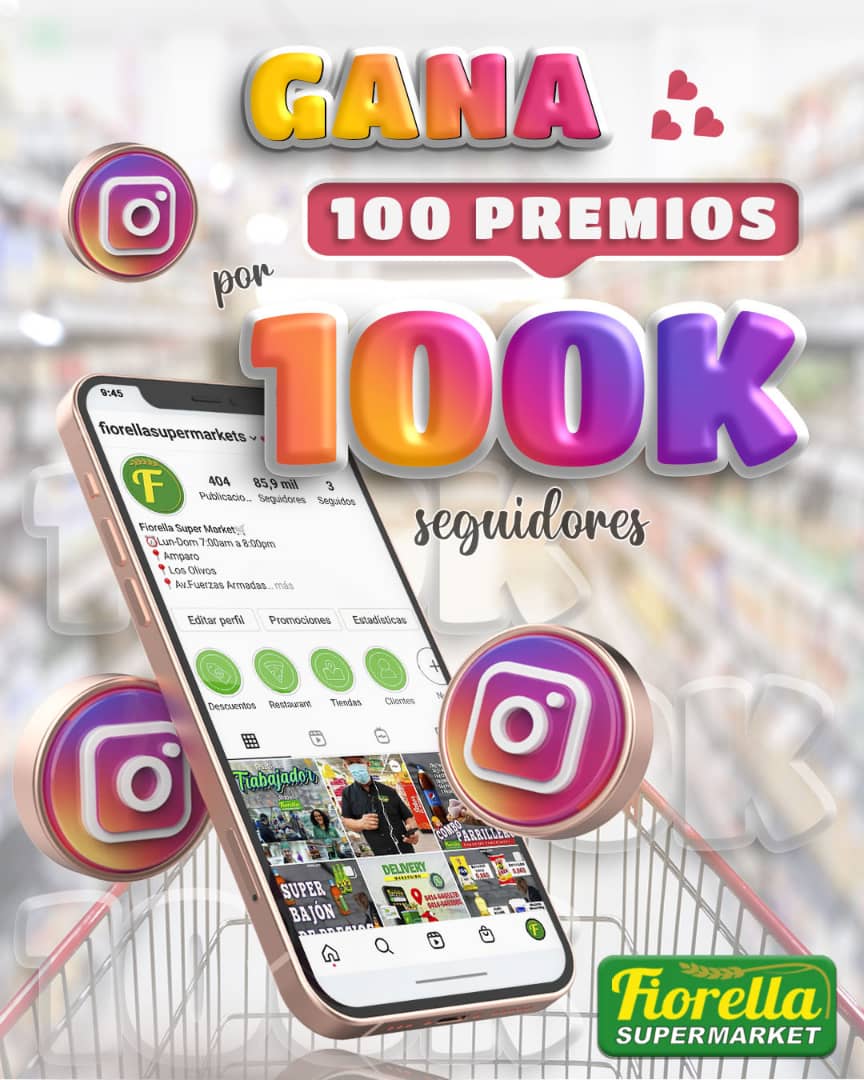 Por si fuera poco activamos esta semana la promoción “100 premios para 100K” con la que entregaremos 100 premios a nuestra distinguida clientela camino a los 100 mil seguidores en la comunidad de nuestra cuenta de Instagram fiorellasupermarkets.