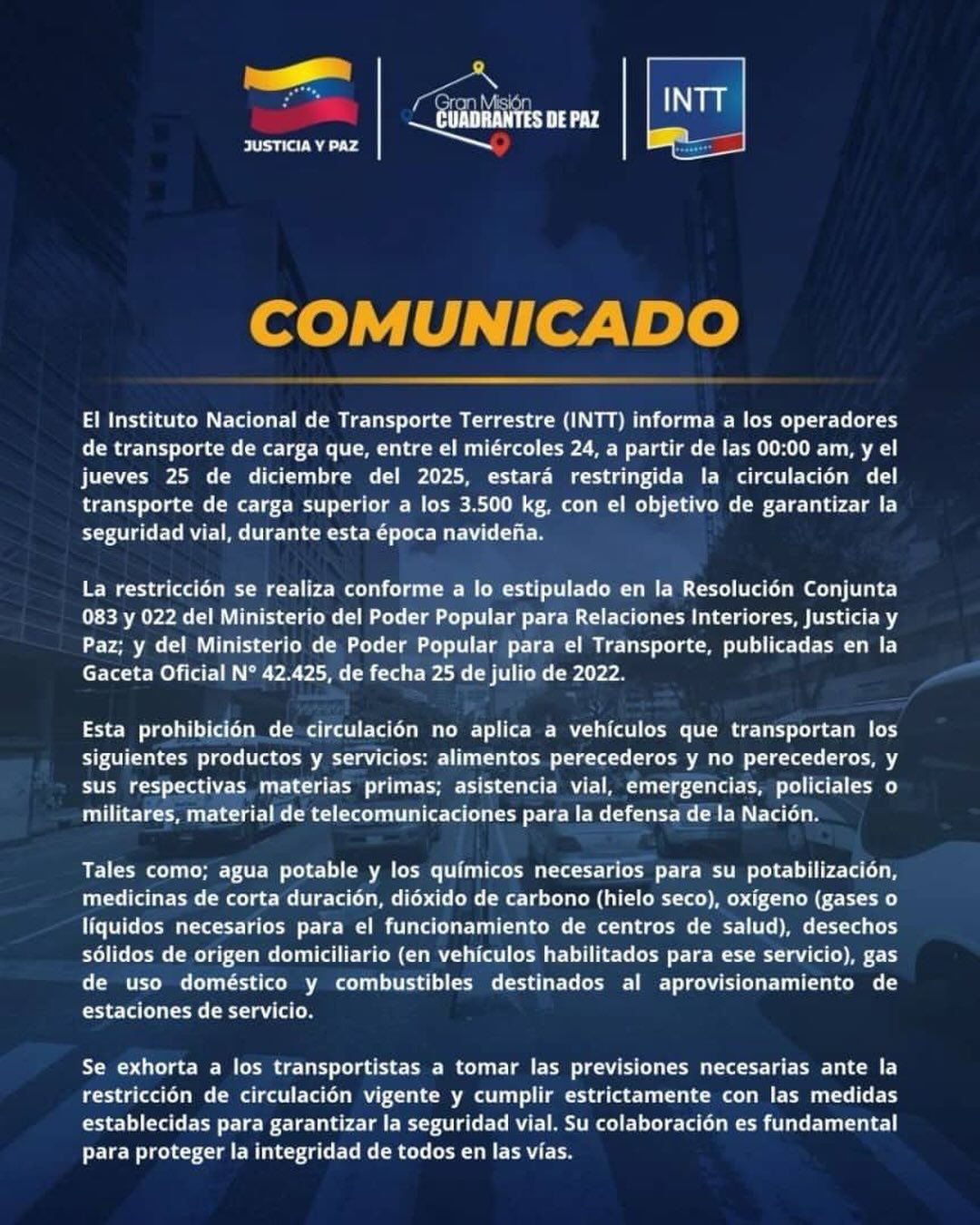 Con el objetivo de garantizar la fluidez vehicular y minimizar los riesgos de accidentes durante el asueto navideño, el Instituto Nacional de Transporte Terrestre (INTT) oficializó la restricción temporal del tránsito para vehículos de carga pesada en todo el territorio nacional.