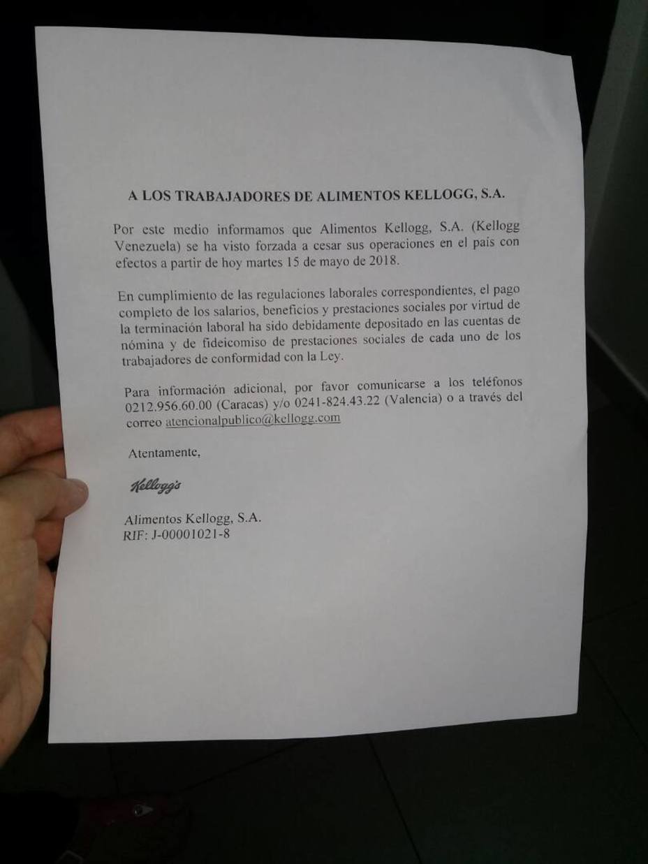 “Por este medio informamos que Alimentos Kellogg’s S.A. se ha visto forzada a cesar sus operaciones en el país con efectos a partir de hoy martes 15 de mayo de 2018”, se lee en la introducción del comunicado.