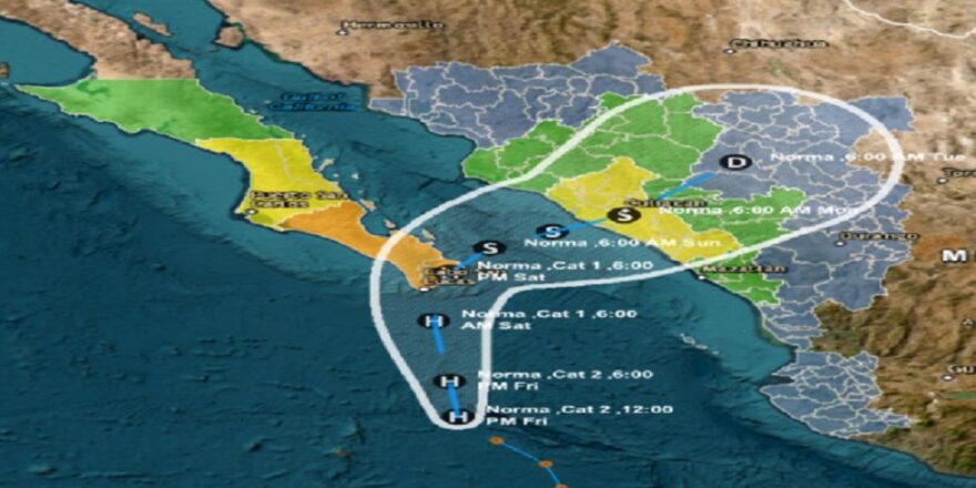 El huracán Norma aumentó este viernes nuevamente su categoría a 3 y se dirige hacia el balneario de Cabo San Lucas, en la península de Baja California, noroeste de México, informó el Servicio Meteorológico Nacional (SMN).