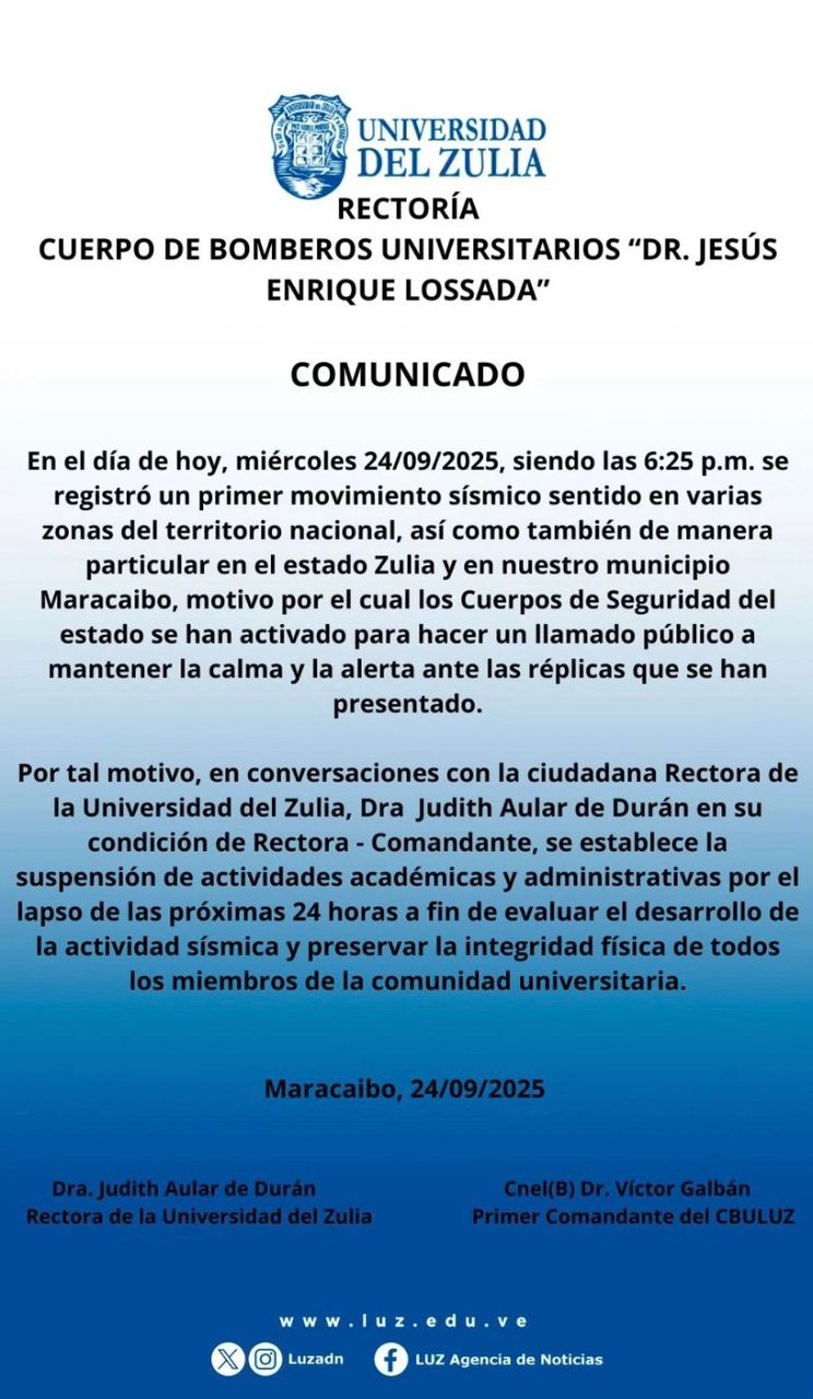 La Universidad del Zulia (LUZ) anunció la suspensión de todas sus actividades académicas y administrativas durante las próximas 24 horas, luego del sismo registrado a las 6:25 de la tarde de este miércoles y que fue sentido en varias regiones del país, especialmente en el estado Zulia.