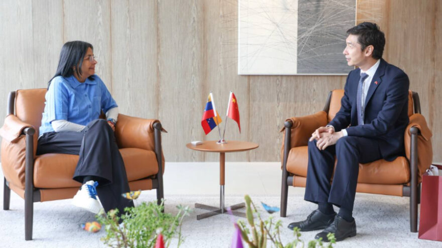 La vicepresidenta Ejecutiva de Venezuela, Delcy Rodríguez, se reunió hoy con el embajador de la República Popular China en el país, Lan Hu, para revisar y fortalecer los aspectos cruciales de la Asociación Estratégica «A Toda Prueba y Todo Tiempo» que une a ambas naciones.