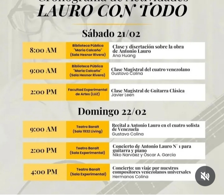 El domingo 22 de febrero, la acción se concentrará en las históricas instalaciones del teatro Baralt. La mañana dominical iniciará a las 9:00 a.m. con un recital único: Gustavo Colina presentará la obra de Lauro adaptada al cuatro solista, demostrando la versatilidad de las piezas originales en las cuerdas del instrumento nacional por excelencia.