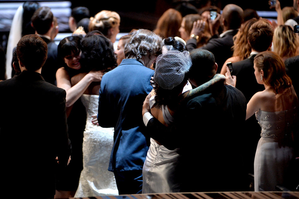 Las 33 parejas, algunas homosexuales, otras heterosexuales pero de diferente raza o nacionalidad, intercambiaron alianzas en un altar con luces de neón durante la 56a edición de los premios Grammy en el estadio Staples Center en Los Ángeles, transformado momentáneamente en una iluminada iglesia con un coro de gospel.