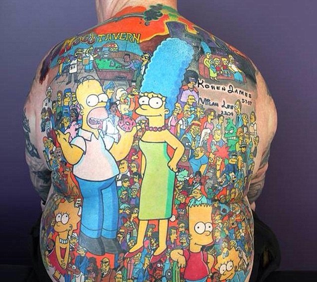 Michael Baxter de 52 años trata de romper el Récord Guinness por la gran cantidad de tatuajes de un dibujo animado. Para lograrlo, ha invertido más de 10 mil dólares y 130 horas de su tiempo para tatuarse 203 personajes de Los Simpsons en su espalda.