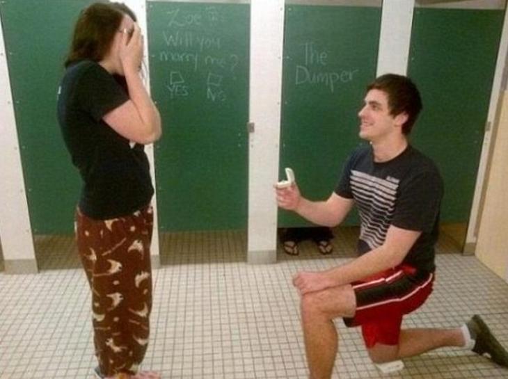 1. Este joven pensó que los baños públicos era el mejor lugar para proponerle matrimonio a su chica.