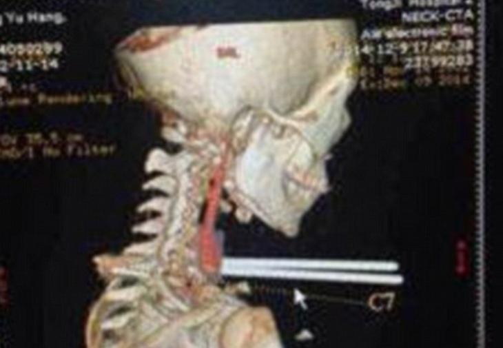 Junio Chia originario de la ciudad de Wuhan (China) sufrió un terrible accidente; el chico de 12 años recibió un codazo en la espalda mientras comía fideos; lo que provocó que se le clavaran dos palillos de metal.