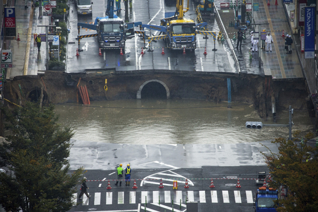 La televisión pública japonesa retransmite en directo la escena, donde se han congregado varias hormigoneras que están llenando el agujero con tierra especial que se solidifica rápidamente.