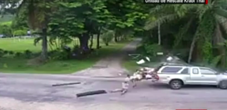 El video muestra el dramático momento en el que un auto embiste a una camioneta gris en Krabi Thai, Tailandia.