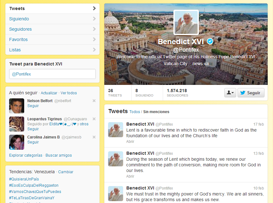 El papa anunció recientemente su renuncia, efectiva el 28 de febrero, fecha en la cual cerrará su cuenta. Sin embargo, la Santa Sede no reveló si el sucesor de Benedicto XVI usará la red social.