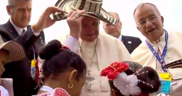 Cartagena es la última parada en el país en la agenda del papa. Niños vestidos con trajes típicos abordaron al pontifice a su llegada, y le regalaron un sombrero vueltiao, símbolo de la cultura colombiana, que de inmediato se puso.