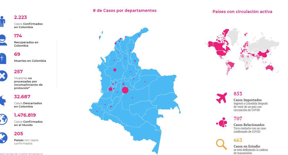 El Ministerio de Salud también señaló que en el país se han hecho 35.120 pruebas que resultaron negativas, mientras 257 no fueron procesadas por incumplimiento del protocolo por factores como temperatura inadecuada o que la muestra fue mal empaquetada, es insuficiente o está sin identificar.