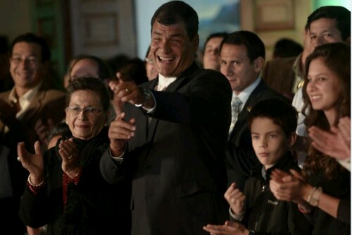Levantando los brazos en señal de triunfo, Correa compareció ante sus partidarios que abarrotaron la Plaza de la Independenciajunto con su candidato a la vicepresidencia, Jorge Glass.»¡Qué viva la patria! Esta patria nueva, justa, de todas y de todos, muchas gracias por este apoyo.