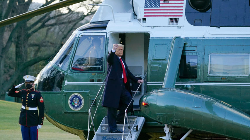 El presidente saliente de Estados Unidos, Donald Trump, abandonó este miércoles la Casa Blanca por última vez como gobernante junto a su esposa, Melania, en el helicóptero presidencial, Marine One, pocas horas antes de la toma de posesión de su sucesor, el demócrata Joe Biden.